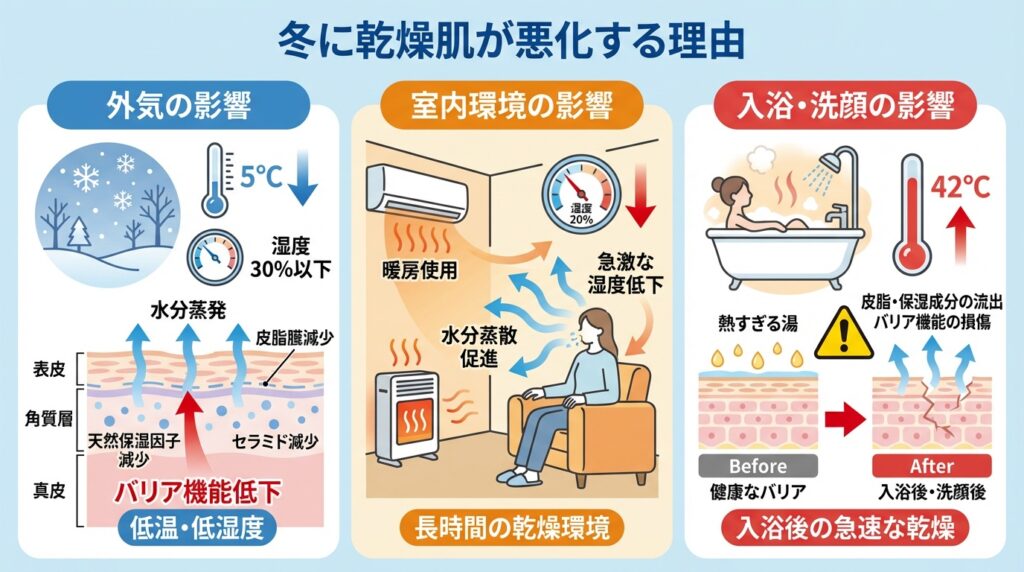外気の低温・低湿度によって皮膚の潤い成分(天然保湿因子など)や皮脂膜、セラミドといった角質層の保湿成分が減少し、水分を保つ力が低下します。その結果、肌のバリア機能が弱まり、カサつきやかゆみなど乾燥によるトラブルが起こりやすくなります。
