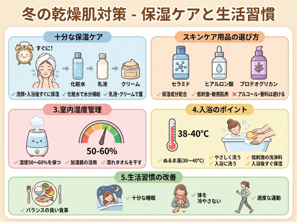 また身体が冷えると血行が悪くなり肌に十分な栄養が届かなくなるため、体を冷やさない工夫や適度な運動も効果的です。暖かい服装や温かい飲み物・食べ物(生姜など体を温める食材)を取り入れて、身体の内側からも乾燥に負けないコンディション作りを意識してください。