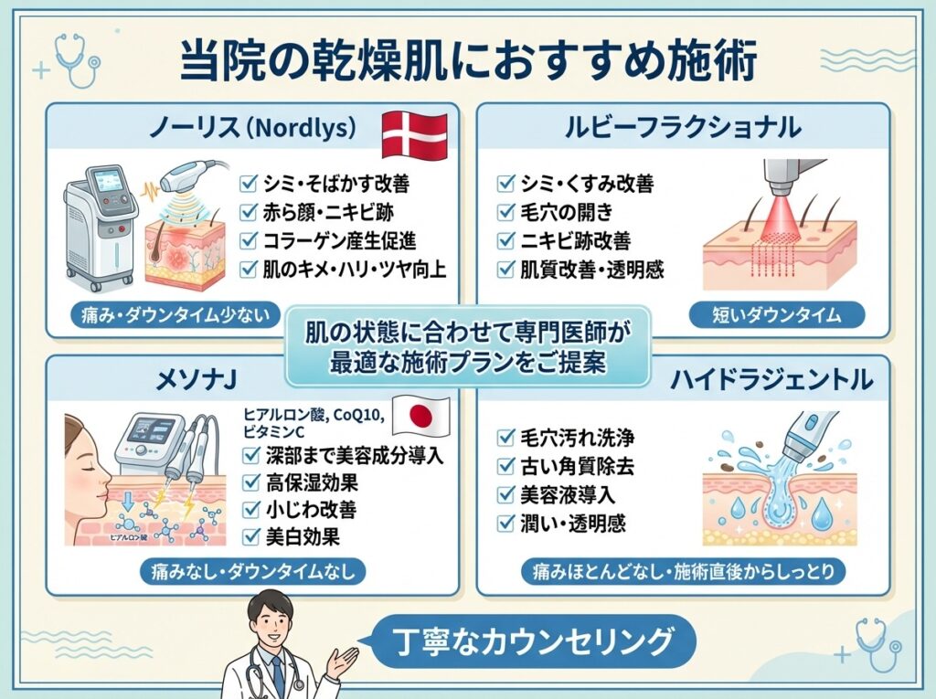 乾燥肌は日々のスキンケアに加えて、美容皮膚科でのケアを取り入れることでより効果的に改善することができます。