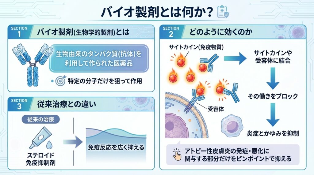 バイオ製剤とは、病気の原因となる体内の物質(サイトカイン)やその受容体をピンポイントで狙い撃ちしてブロックする抗体医薬のことで、皮膚の炎症やかゆみに深く関与する物質だけを選択的に抑えるため高い有効性と副作用の少なさが特徴です。