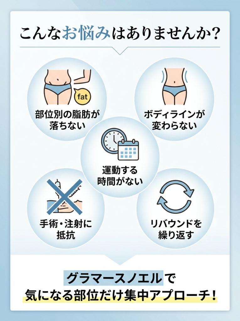 「部分痩せは難しい」という言葉をよく耳にしますが、通常の運動や食事制限では特定部位の脂肪を狙い打ちすることは確かに簡単ではありません。グラマースノエルは、そうした従来のダイエット方法では対応しにくかった「気になる部位だけ」に集中してアプローチできる点が特長です。