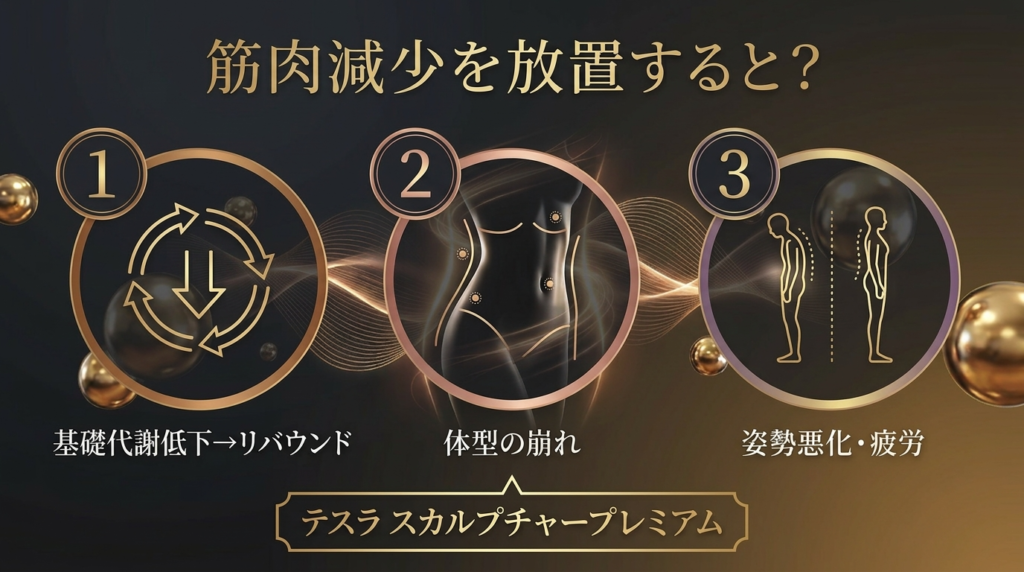 体型の変化や筋肉量の低下は、見た目だけの問題ではありません。緊急を要するわけではありませんが、早い段階で対処しておくことが、将来の健康や生活の質を守ることにもつながります。