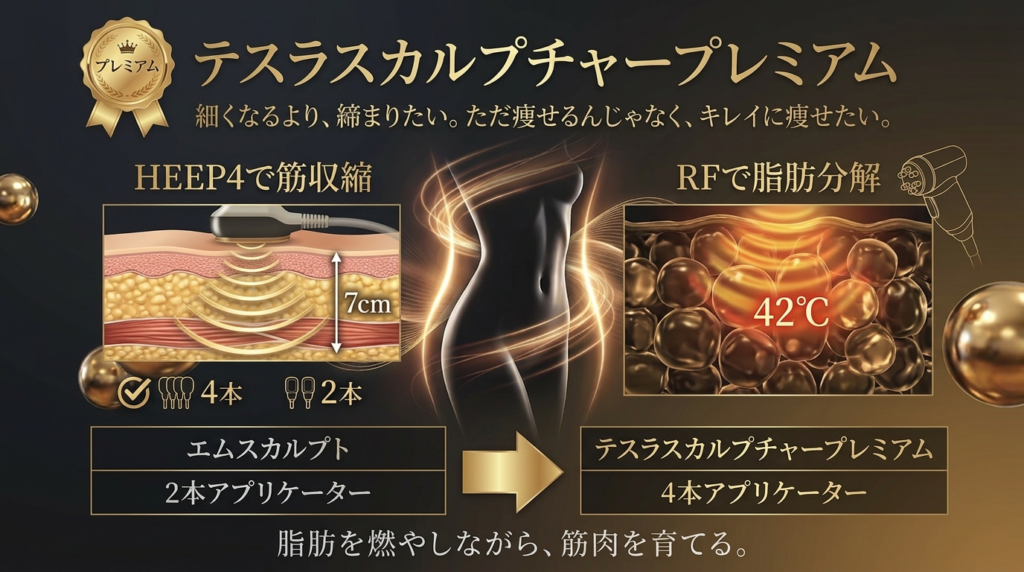 当院が導入した「テスラスカルプチャープレミアム(Tesla Sculpture Premium™)」は、高エネルギー電磁パルス(HEEP4)と高周波(RF)エネルギーを同時に照射することで、脂肪を減らしながら筋肉を鍛えるという、これまでの痩身機器にはなかったアプローチを実現した医療用ボディメイクマシンです。